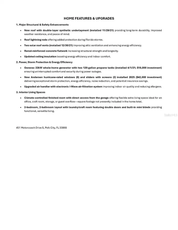 Imagine yourself living in this meticulously maintained 2-bedroom, 2-bath home in the highly desirable Mt. Olive Shores North. Living in this vibrant 55+ maintenance-free RV community is a lifestyle upgrade waiting to happen. This property is perfectly positioned on an oversized, prime lot offering stunning expansive open rear views which overlook a serene pond and a peaceful natural backdrop. This home boasts numerous features and upgrades, see details in the photos. Highlights include a new roof (2021), Generac wholehome generator (2021), and new hurricane rated Anderson windows and sliders (2025). Step inside and be captivated by the open-concept dining and living area, bathed in natural light. Your eyes will immediately be drawn to the expansive lanai, complete with a covered ceiling and extended screened area. This is the perfect space for relaxing, entertaining, and fully embracing Florida's coveted indoor/outdoor lifestyle. The home also features elegant, diagonal- set tile floors in the main living areas and wood look tile in the bedrooms, a convenient laundry/craft room, a central vacuum system, and stylish window valances with new blinds. Quality interior furnishings may be available for purchase. For the RV enthusiast, this property is a dream come true. The well-equipped RV port, measuring 48.5 x 15.5, features dual water, 50-amp service, and sewer hookups on both sides, allowing for effortless pull-in or back-in RV access. In addition, there is a one-car garage with a carport, and a climate-controlled finished room accessible from the garage with exterior access. This unique area offers extra living space perfect for an office, craft room, or additional storage. The property has been professionally landscaped and features a well with a 5-zone irrigation system, ensuring a lush and vibrant yard year-round. This is a MUST-SEE property, and we don't expect it to stay on the market for long. Call today to schedule your appointment and experience this exceptional home in a welcoming community for yourself.